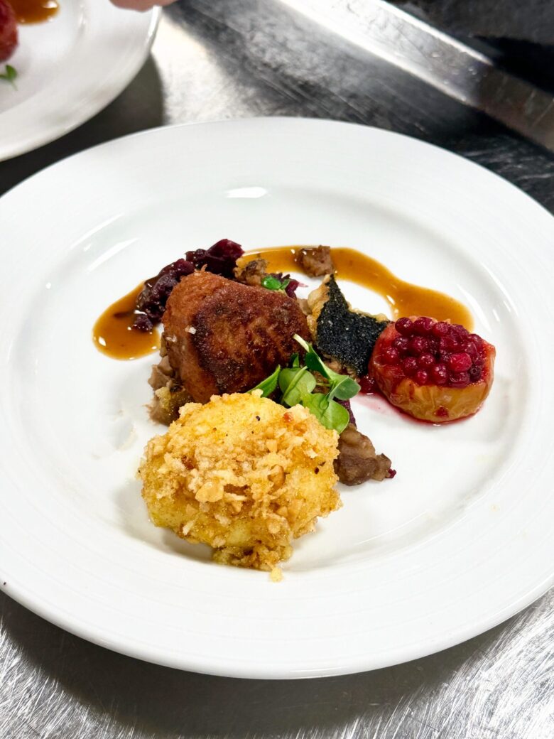 25.5gefüllt mit Schinken und Bergkäse, serviert mit Pommes Frites dazu Wildpreiselbeeren